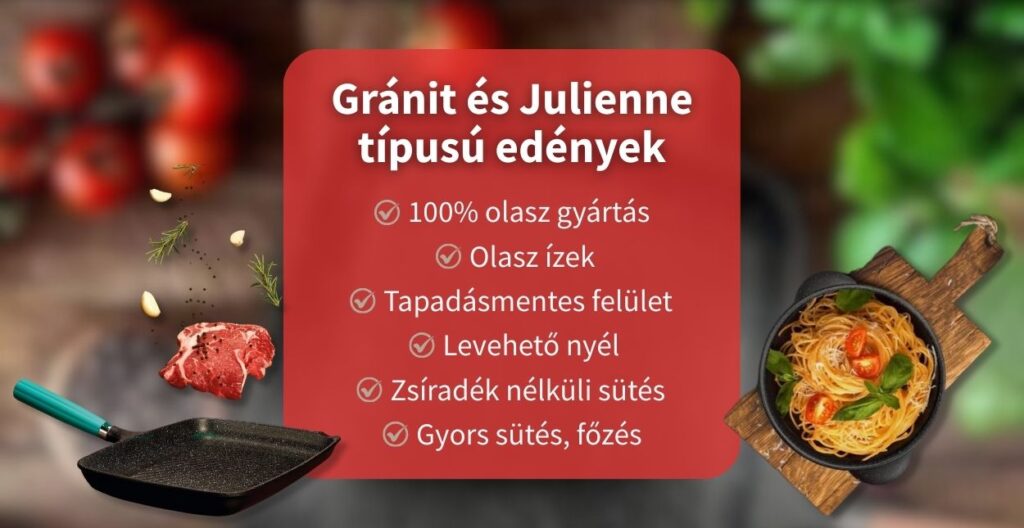 Serpenyők Pizza és palacsinta Főzőedények Wok Tepsik Tálalók Grillezők Fedők és kiegészítők Serpenyők Tepsik Pizza és palacsinta Főzőedények Grillezők Wok Tálalók Fedők és kiegészítők Feliratkozás hírlevélre Név Email Üzenet Hozzájárulok az adataim kezeléséhez és elfogadom az Adatvédelmi Nyilatkozat-ot Feliratkozás Kihagyhatatlan ajánlat! Receptek 2025-02-24 Julienne serpenyőkben, Julienne Indukciós serpenyőkben és Gránit Indukciós serpenyőkben készíthető ételek receptjei… Tovább olvasom » Indukciós konyha előnyei 2025-02-24 A konyha világát mostanra a legmodernebb indukciós rendszerekkel forradalmasították. Innovatív főzőlapok és edénykészletek… Tovább olvasom »